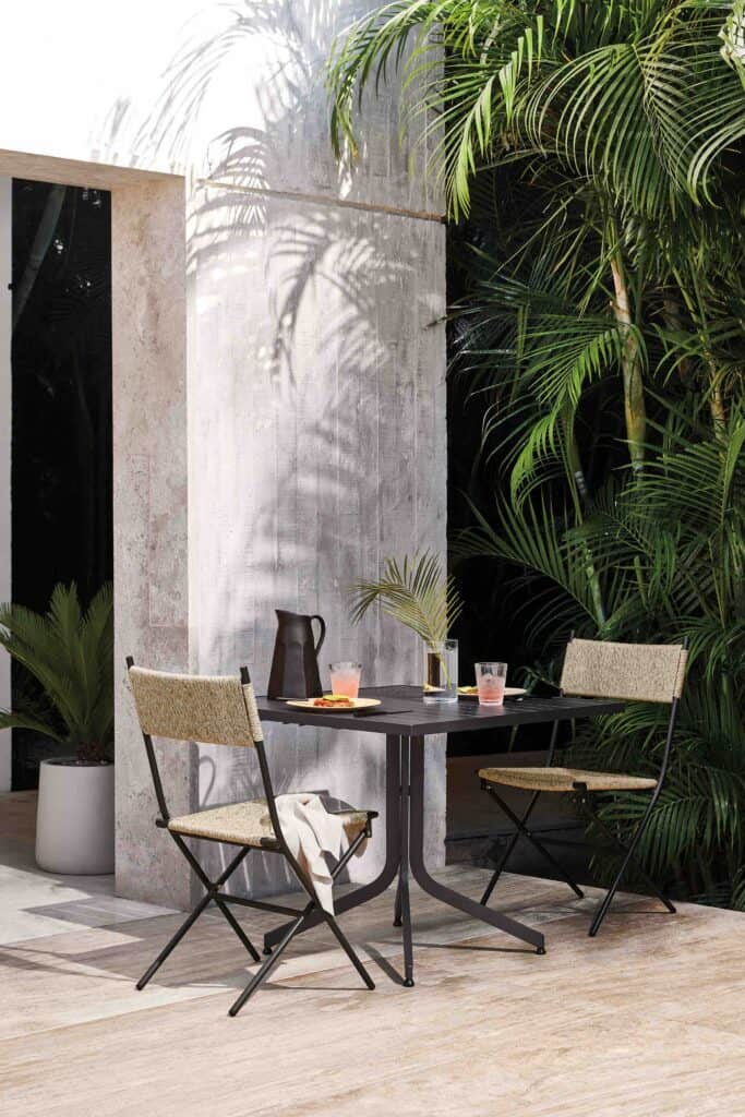 Bamboo 10-ounce double old fashioned glass; Lanai 35” square flip top outdoor dining table