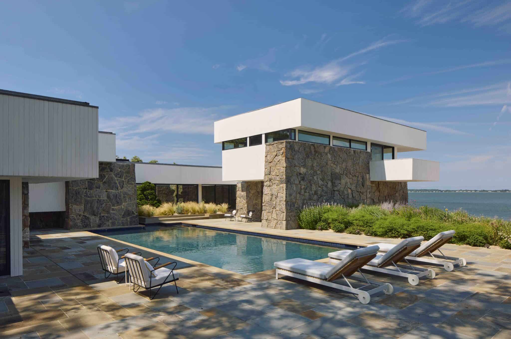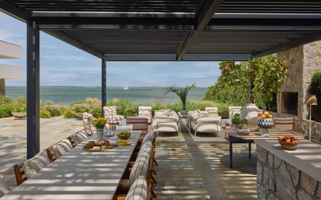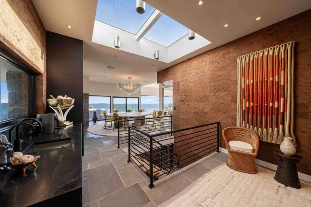 The grounds unfold in a series of terraces and cantilevered decks that mirror Jaffe’s signature interplay between geometry and landscape. An extra-deep heated gunite pool anchors the outdoor entertaining areas, which also include a pergola outfitted with a kitchen and fireplace, a tennis court lined for pickleball and coastal-inspired landscaping woven with pollinator gardens.