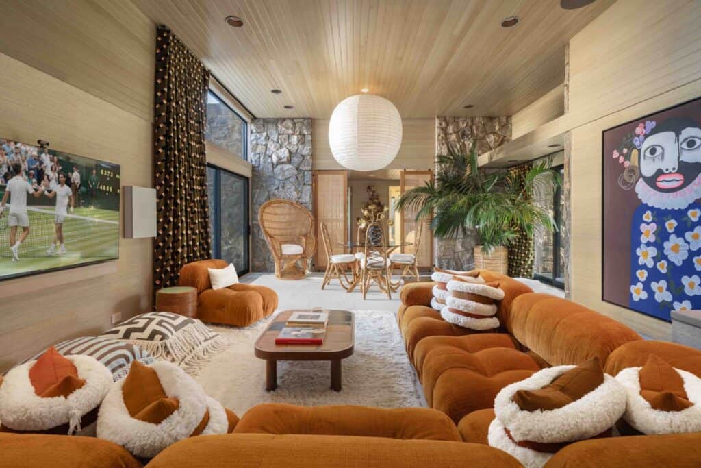 Upstairs, Brougham softened the dramatic effect of a blocky granite fireplace and floor-to-ceiling plate-glass windows with a plush white rug and a semicircular gray bouclé de Sede sofa, blending midcentury gravitas with contemporary warmth. The interiors balance spectacle and livability.