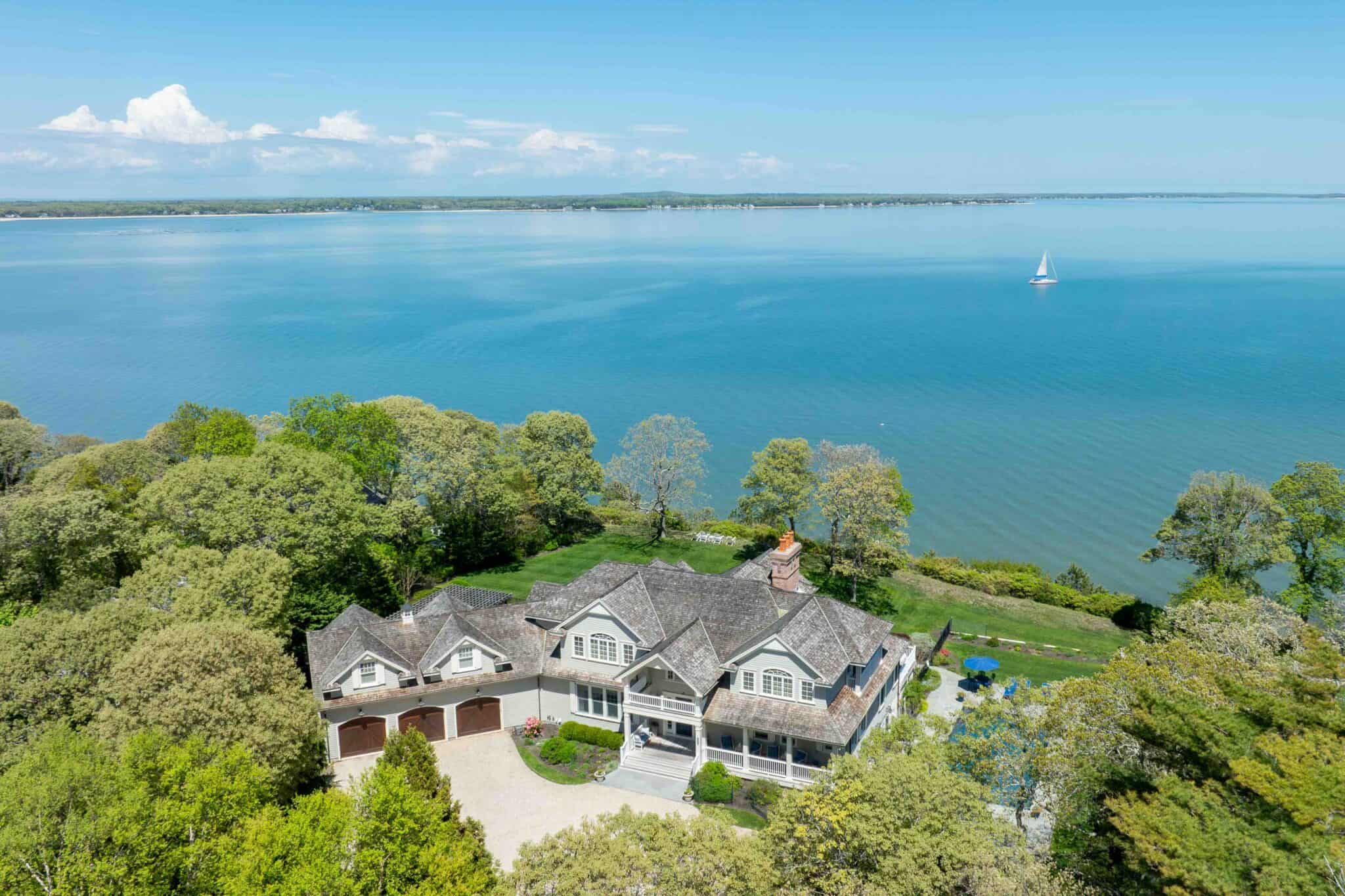 Set on two landscaped acres with 200 feet of private bay beach, the property delivers a rare combination of elevation, privacy, and uninterrupted water views of the Peconic Bay.