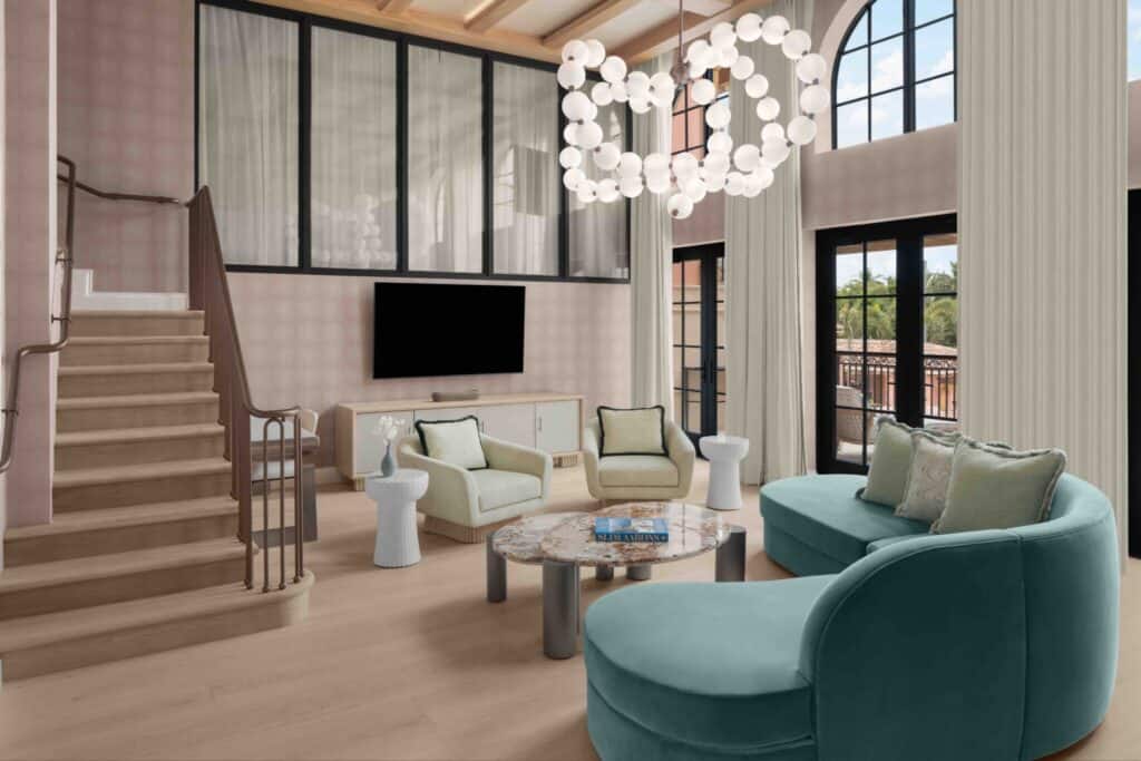 The hotel features 79 luxurious suites, but the pièce de résistance is the Presidential Suite, a colossal two-story suite spanning 1,982 sq. ft. The moment you step inside, it’s hard to know where to look first: the Art Deco glass ball chandelier, the oversized art about the dining table, or the seductive, emerald coach that’s curved towards the floor-to-ceiling windows. On the second floor, the sleeping area features an Alaskan King-sized bed (the largest hotel bed in Palm Beach) and a wall-to-wall headboard. The one-bedroom, 1.5-bathroom suite also features a kitchen, full-size living room, dining room, and two private balconies overlooking the pool.